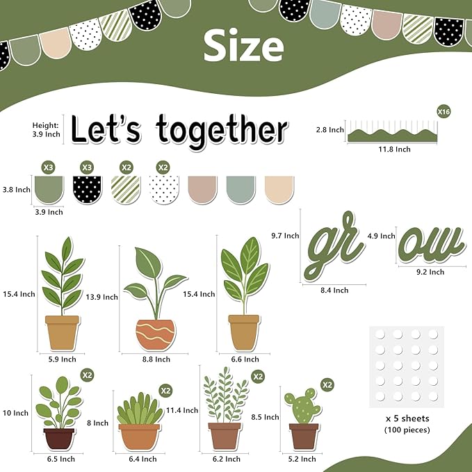 - Package Include: You will receive 60 piece of classroom bulletin board decorations, which include 11 set of potted plant, 16pcs of bulletin board border cutouts, 13 pc bunting, 15pcs letters of “Let’s Grow Together”, and 100 piece of adhesive dots (5 sheets)